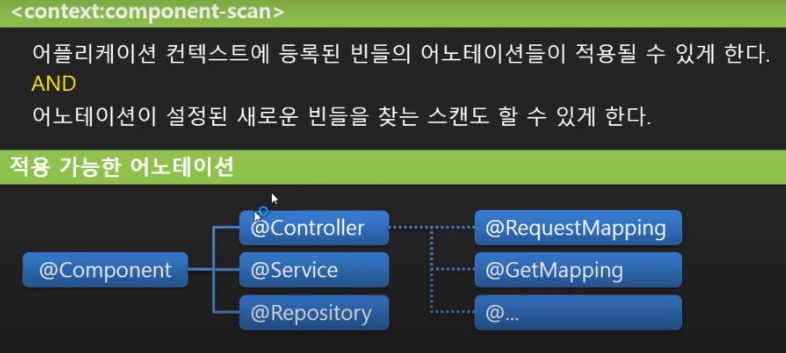 @ComponentScan : 어노테이션이 부여된 클래스들을 자동으로 스캔하여 bean으로 등록해주는 역할