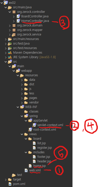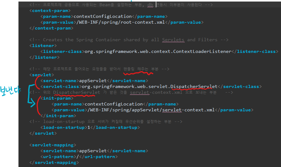 프로젝트가 실행되면 가장 먼저 web.xml 이 실행되고 DispatcherServlet이 해당 프로젝트의 요청들을 받아서