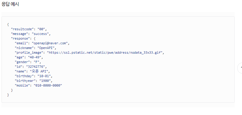 * "response":{"id":"33666449","nickname":"shinn****","age":"20-29","gender":"M","email":"sh@naver.com","name":"\uc2e0\ubc94\ud638"}}