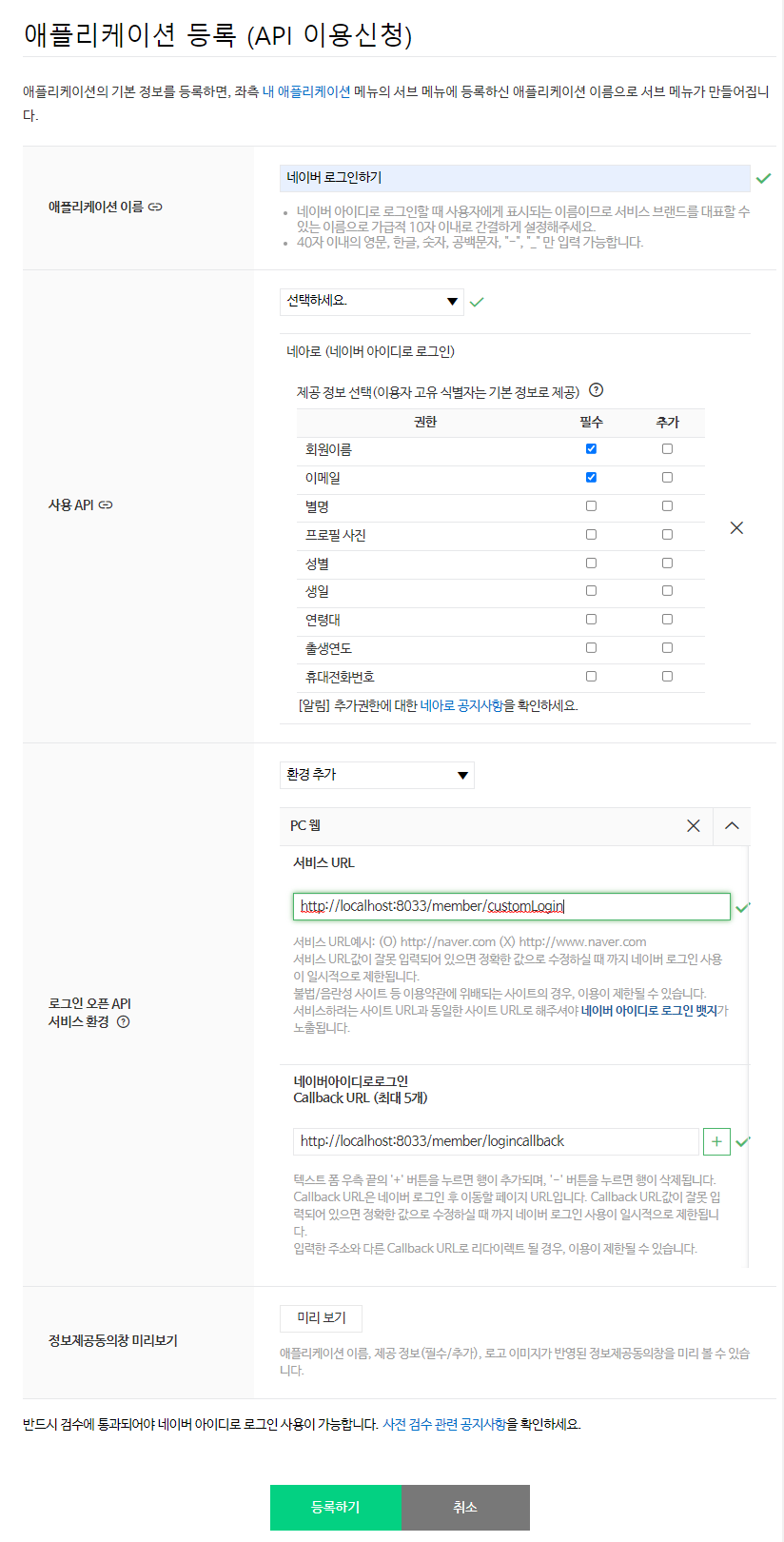 로그인 오픈 API 서비스 환경 에서 서비스 URL은 네이버로그인 을 하는 시작페이지를 넣고
