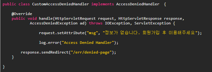 CustomUser에서 getAuth 값이 null이라면 AccessDeniedHandler 를 구현하여 시큐리티가 알아서 에러페이지를 핸들링 할수 있는 커스텀 까지 가능하다