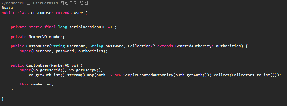 UserDetailsService를 상속하는 직접 커스텀한 CustomDetailsService의 반환타입인 CustomUser 를 확인하면 MemberVO를 파라미터로 받아 인증객체를 생성하고있으며 MemberVO 안에는 AuthVO 로 접근권한을 설정할 수있는 필드값을 확인할 수 있다.