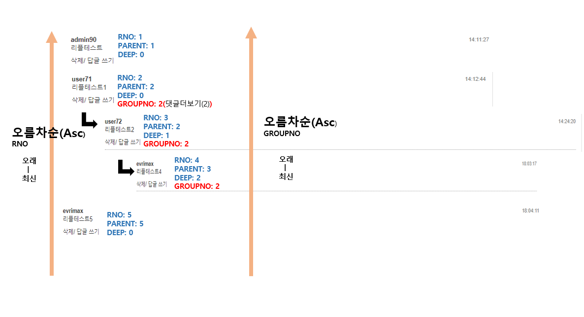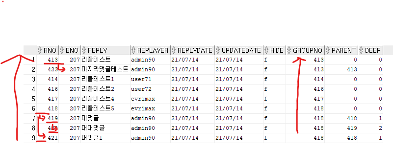 RNO 423번이 저기 있는 이유는 첫째로 RNO를 기준으로 오름차순이 진행되고 두번째 GROUPNO 기준으로 정렬되는 과정에서 저렇게 세팅됨으로서 대댓글 작성시 바로 아래 표현할수 있게된다.(실행 순서상의 이유)