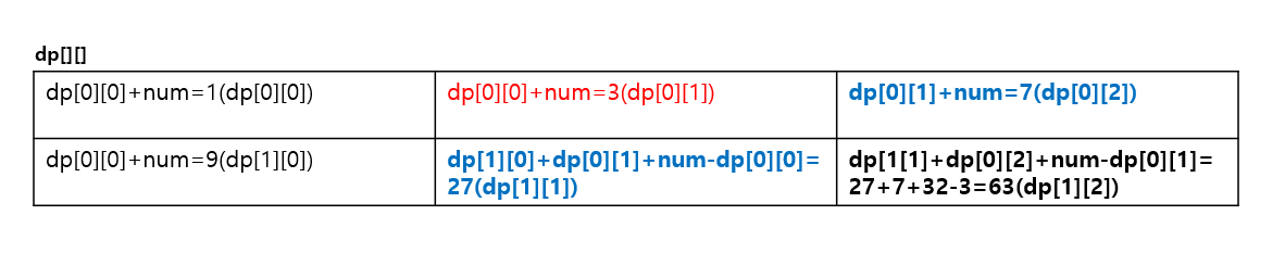 빨간색 부분은 공통적으로 dp[x][y] 을 구할때 위의 값과 왼쪽값을 더하게 되는데 중복으로 발생하는 숫자를 한번 빼줘야한다.