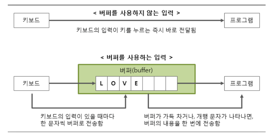 버퍼는 한글자씩 입력이 되자마자 전송을 준비하기위해 임시로 저장되는 메모리 영역에 한글자씩 저장된다.