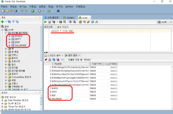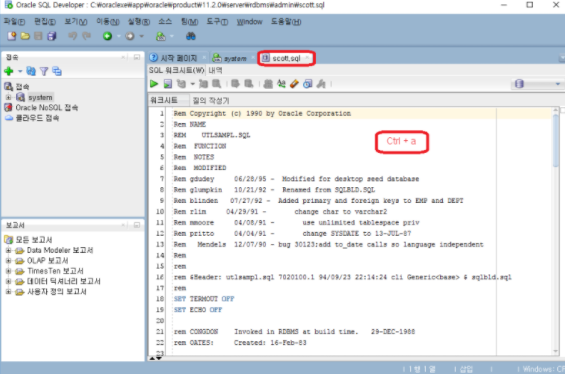 scott.sql 탭이 열리고 ctrl+a 로 전체 선택 후 ctrl+enter 또는 f5로 실행버튼을 누른다.