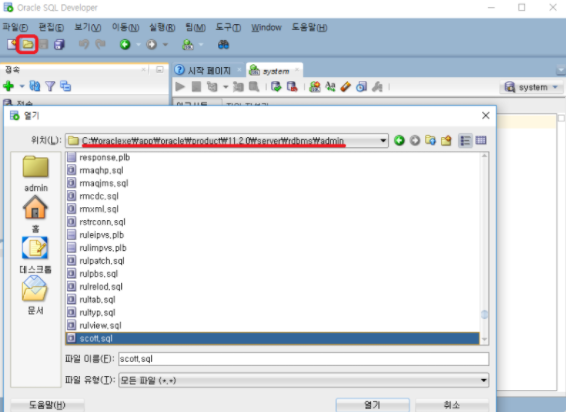 파일 열기로 눌러 자신의 오라클경로로 들어가 admin 폴더에서 scott.sql 파일을 열어준다.