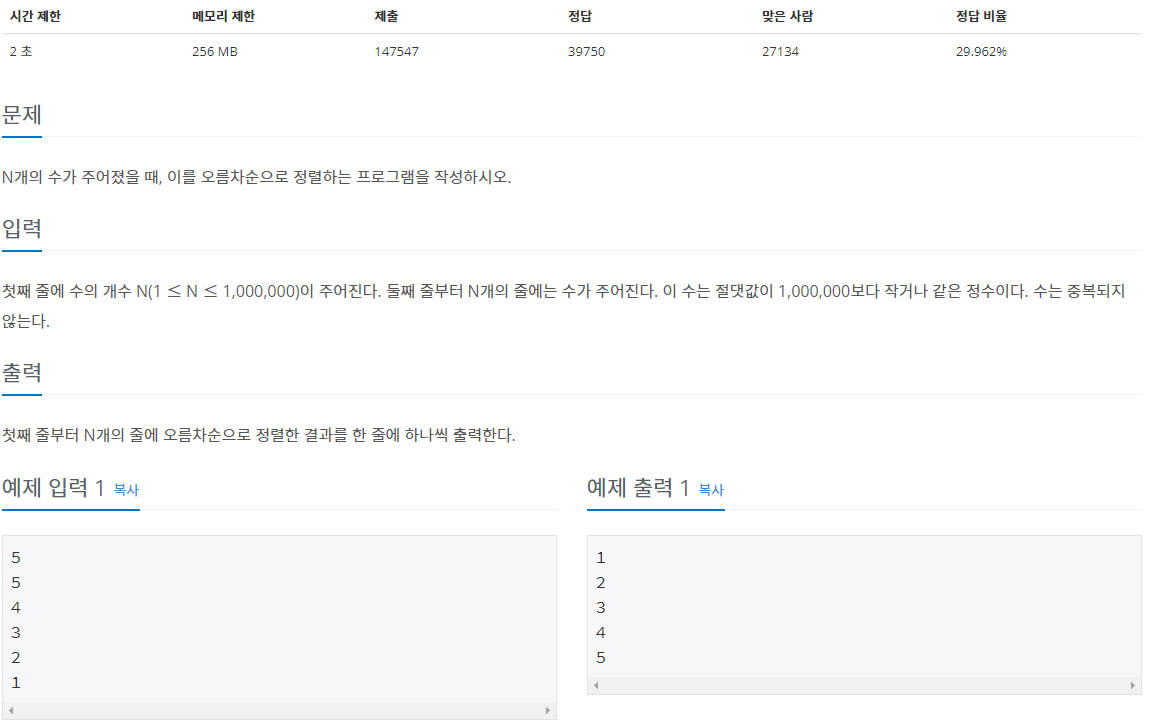 | import java.io.BufferedReader; import java.io.BufferedWriter; import java.io.InputStreamReader; import java.io.OutputStreamWriter; import java.util.ArrayList; import java.util.Collections; public class Main { public static void main(String[] args) throws Exception { BufferedReader br = new BufferedReader(new InputStreamReader(System.in)); BufferedWriter bw = new BufferedWriter(new OutputStreamWriter(System.out)); int N = Integer.parseInt(br.readLine()); ArrayList<Integer> arr = new ArrayList<>(); for (int i = 0; i < N; i++) { arr.add(Integer.parseInt(br.readLine())); } // Arrays.sort가 아닌 Collections.sort를 사용한다. Collections.sort(arr); StringBuilder sb = new StringBuilder(); for (int i = 0; i < N; i++) { sb.append(arr.get(i) + "\n"); } bw.write(sb.toString()); bw.flush(); bw.close(); br.close(); } } |