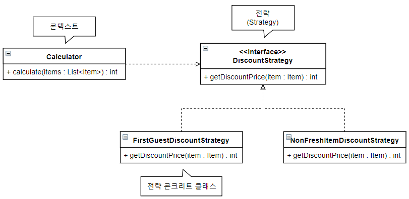 Calculator 클래스는 생성자를 통해 사용할 전략 객체를 전달 받고, calculate() 메서드에서 각 Item의 가격을 계산할 때 전략 객체를 사용하고 있다.