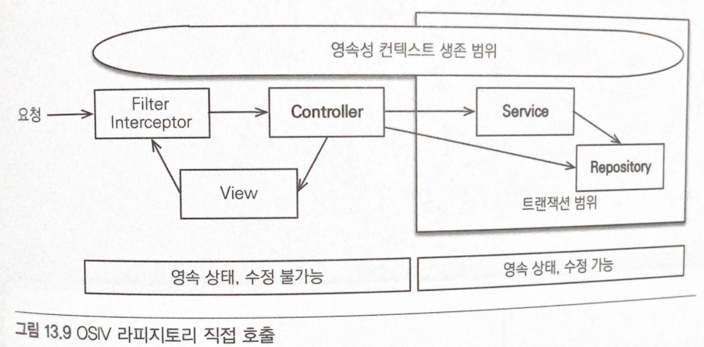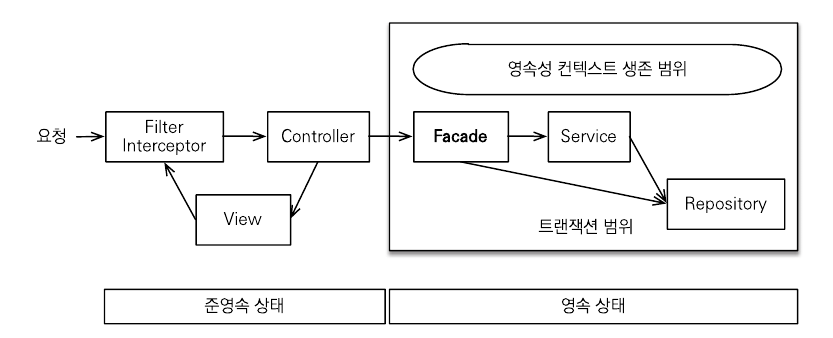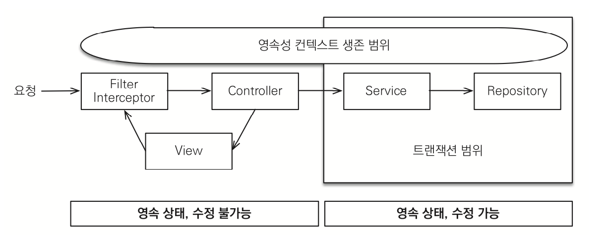 - 프리젠테이션 계층에서 em.flush()를 호출해서 강제로 플러시해도 트랜잭션 범위 밖이므로 데이터를 수정할수 없다는 예외를 만난다