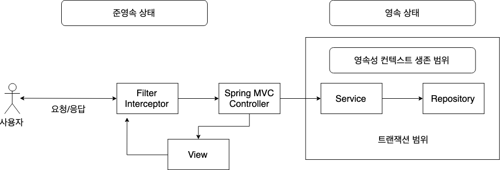 2.서비스 계층에서 @Transactional로 트랜잭션을 시작할 때 1번에서 미리 생성해둔 영속성 컨텍스트를 찾아와 트랜잭션을 시작한다.