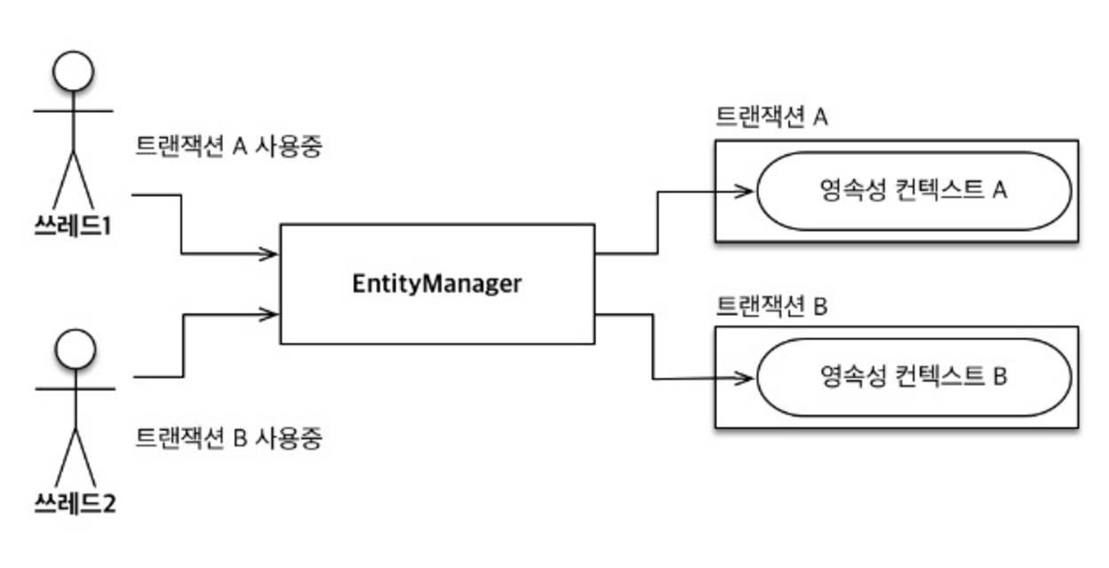 - 같은 엔티티 매니저를 사용해도 트랜잭션에 따라 접근하는 영속성 컨텍스트가 다르다.