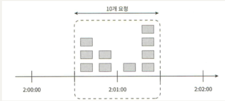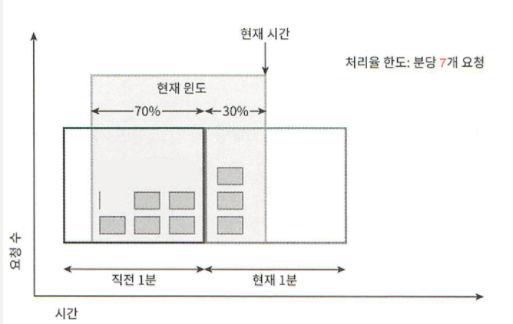 타임스탬프를 추적, 보통 타임스탬프 는레디스의 정렬 집합같은 캐시에 보관 - 새 요청이 오면 만료된 타임스탬프는