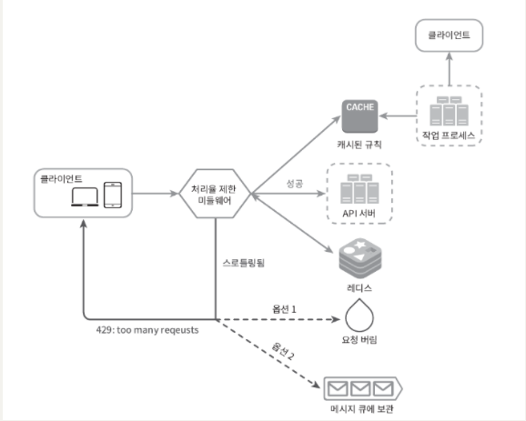 - 제한에 걸리면 429 에러를 클라이언트에게 보낸다, 해당 요청은 버리거나