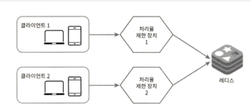 - 처리율 제한 미들웨어는 레디스의 지정 버킷에서 카운터를 가져와 한도에 도달했는지 아닌지 검사