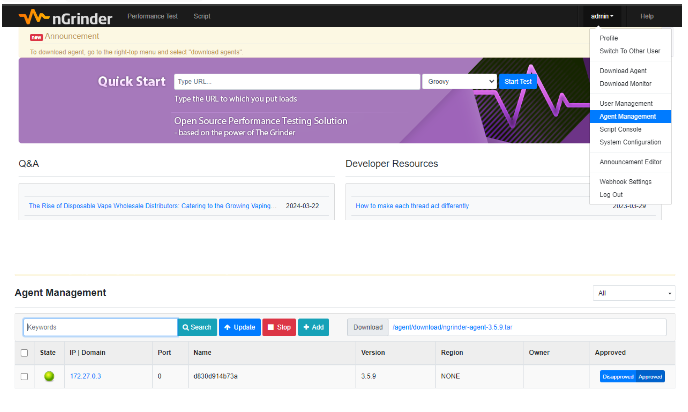 - Agent : 테스트에 사용할 Agent 갯수 지정. 현재 max가 1개 이지만 위 Docker를 통해 Agent를 생성하는 과정을 통해 갯수를 늘릴 수 있음