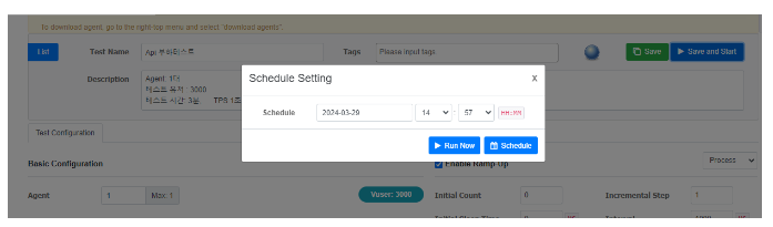 테스트 시작 시간을 정한 후 Run Now 클릭