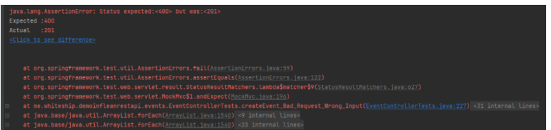 우리는 결과를 400을 예상했지만 비즈니스 로직은 성공적으로 진행되며 201를 뱉는다. 테스트는 실패했다.