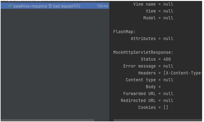 테스트는 파라미터로 들어온 TestDto 의 basePrice, maxPrice 검증이다