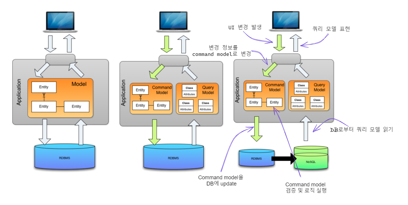 - 읽기는 쿼리에 최적화 된 스키마를, 쓰기는 명령에 최적화된 스키마를 사용한다.