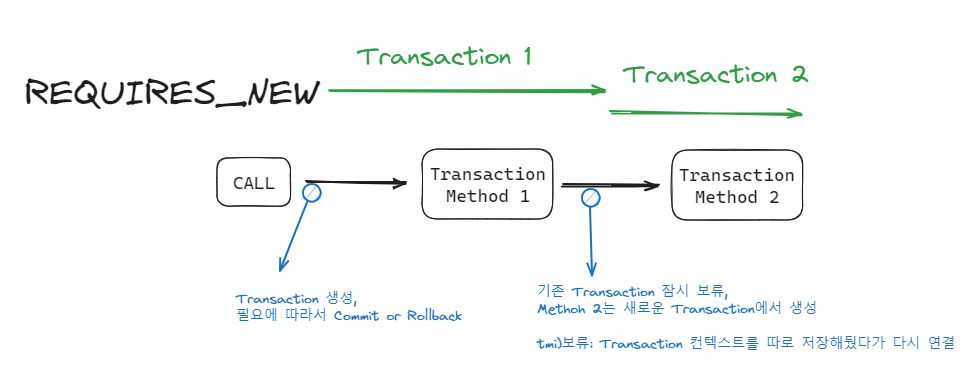- 기존 트랜잭션이 존재한다면 기존 트랜잭션을 보류하고 새로운 트랜잭션을 생성한다.