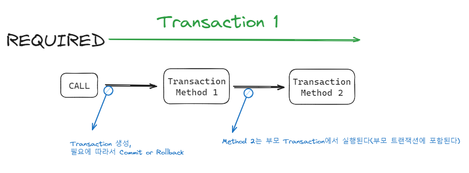 - 기존 트랜잭션에 포함되었을 때는 기존 트랜잭션의 커밋이 완료될 때 커밋되고, 롤백시 함께 취소된다.