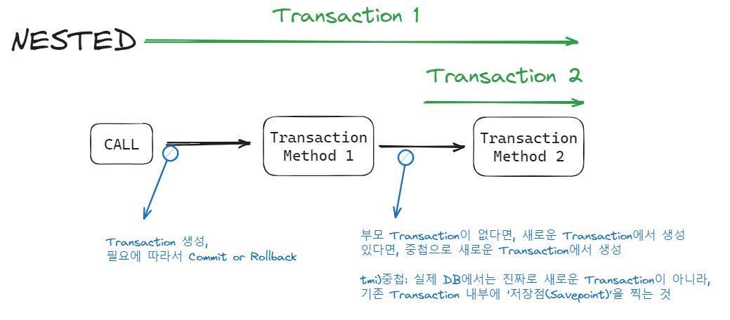 NESTED는 JDBC의 세이브 포인트라는 기능을 이용해서 동작한다. 세이브 포인트를 이용해 부모 트랜잭션을 잠시 멈추고 자식 트랜잭션을 실행한다.- 일부 DB에서만 적용되는 방식이다.(mysql)