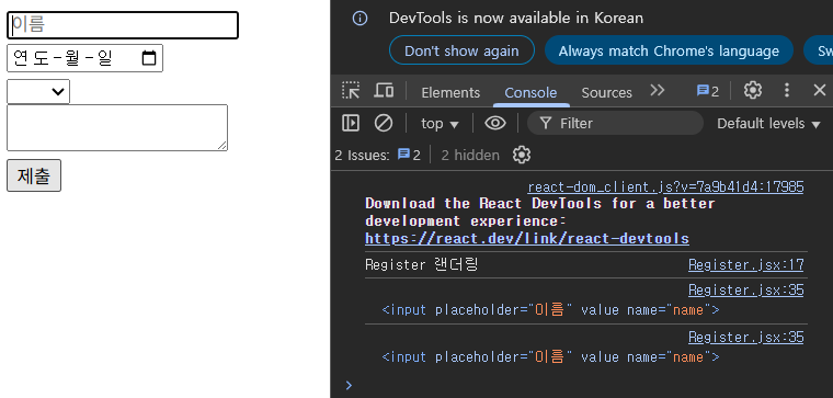 그리고 Register 컴포넌트를 2번호출 했을때 문제가 발생한다.