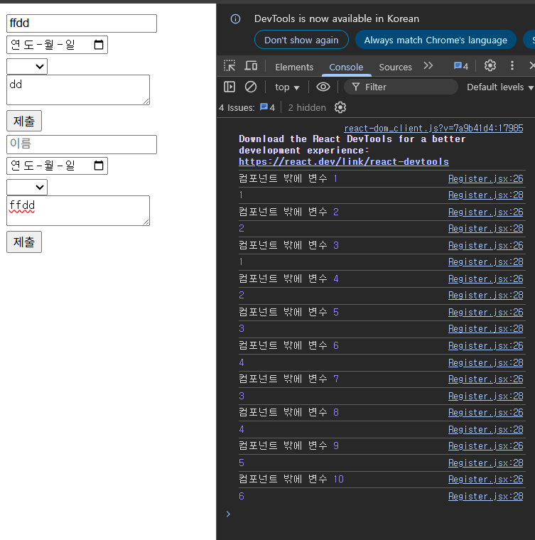Register 가 2번 호출되었지만 내부의 상태값들은 각각 관리되어야 하지만 컴포넌트 외부에 선언된 변수는 공유가 된다.