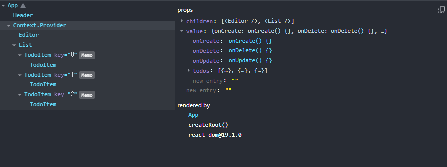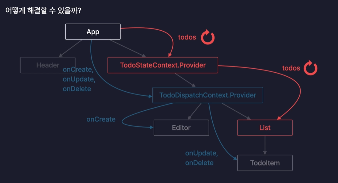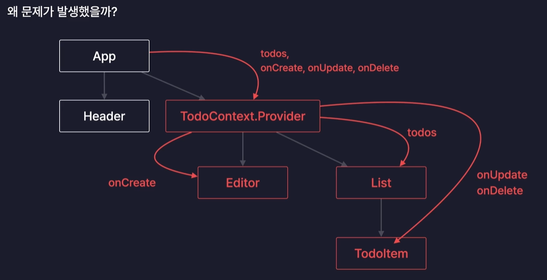 때문에 todos, onCreate 같은 App 컴포넌트의 Props가 바뀌면 결국 TodoContext.Provider 컴포넌트도 리랜더링 되고 그 자식들인 Editor, List, TodoItem 모두 리랜더링 된다.