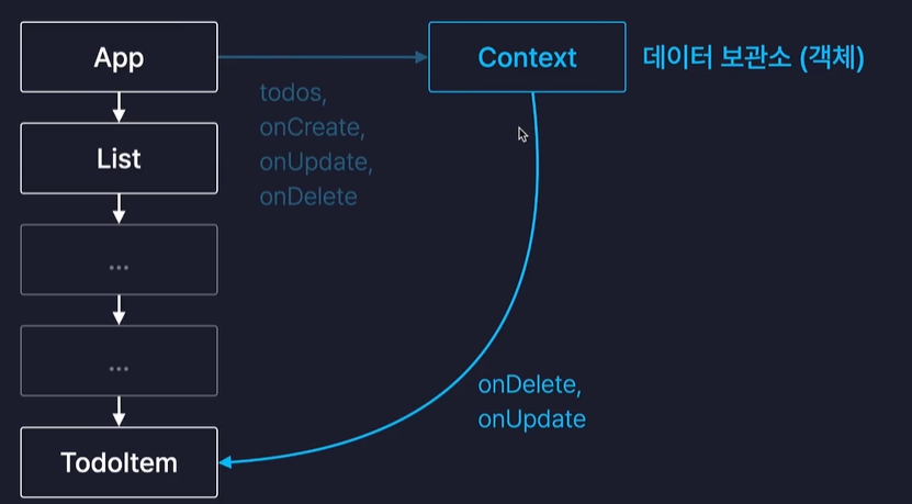 기존에 넘겨줘야 했던 데이터들(onCreate, todos 등)이 Context.provider 내에 선언된 것을 확인 할 수 있다.