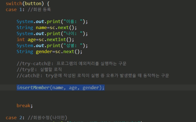 System.out.println("[1]회원등록 [2]회원수정 [3]회원조회 [4]회원삭제 [5]종료 :");