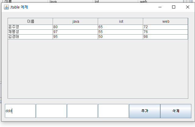 private DefaultTableModel model; //JTable의 데이터를 추가하거나 삭제할 때